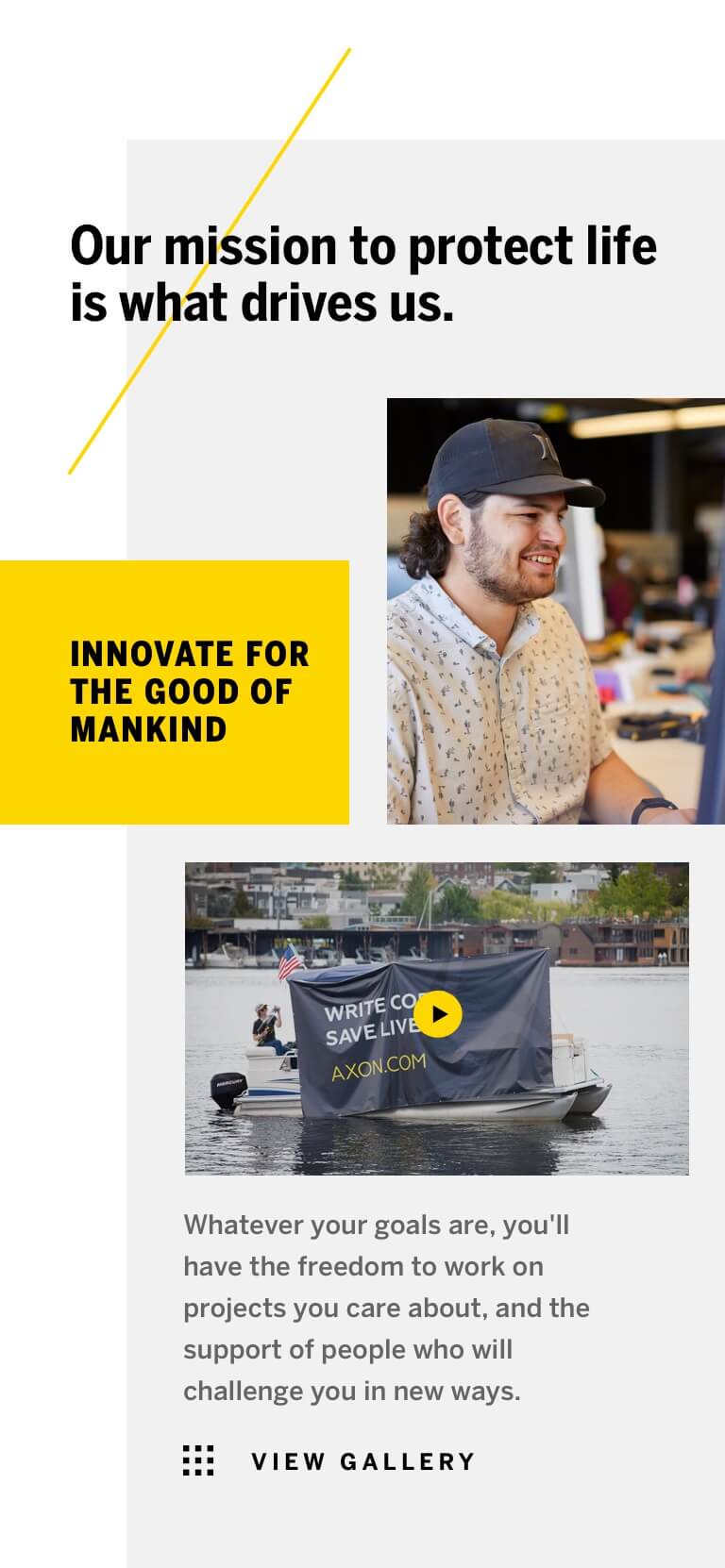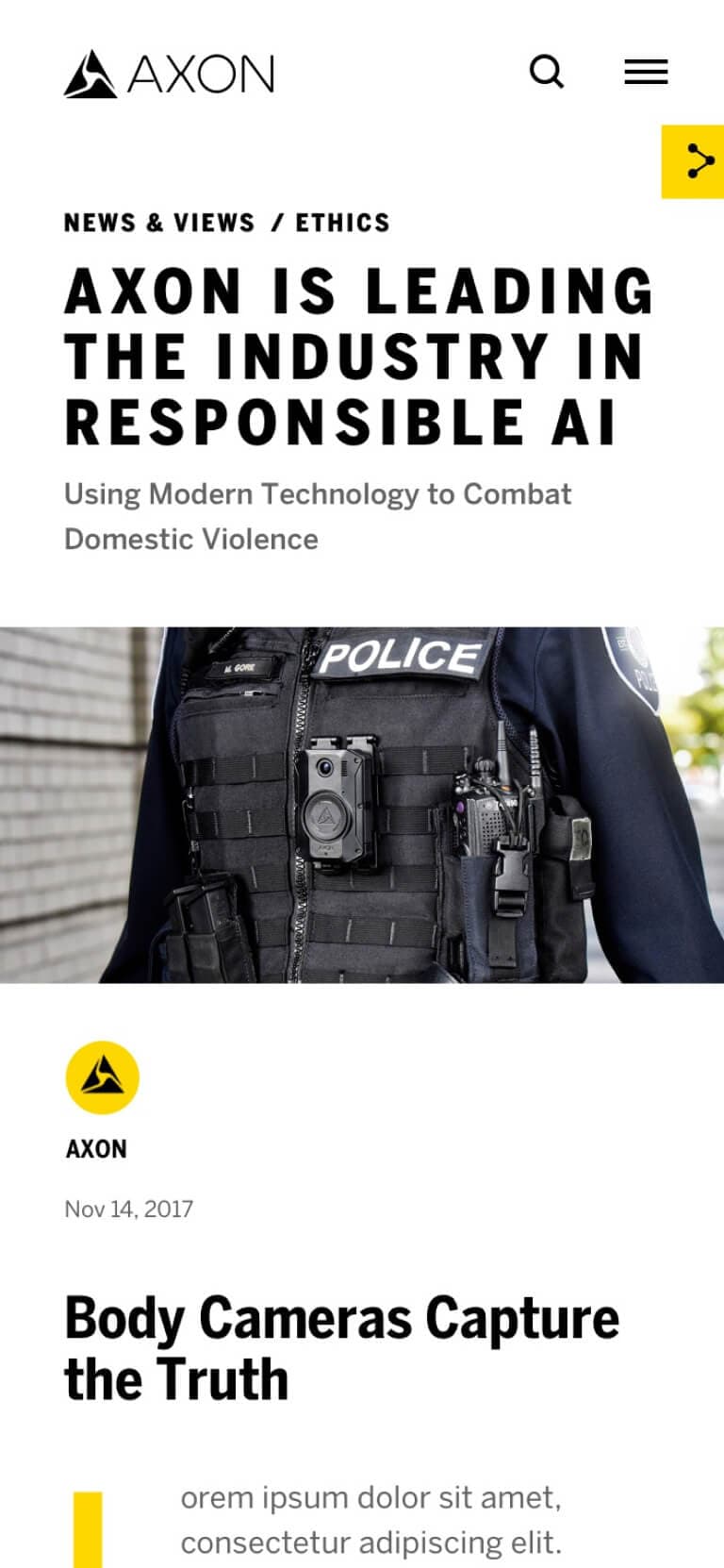 ANML helped Axon clearly communicate their story across its website while creating a design language and user experience that parallels the technology and quality of its products. From educating law enforcement agencies on the benefits of the axon ecosystem to inspiring new employees, we'd like to think we played a small role in protecting life - through design.