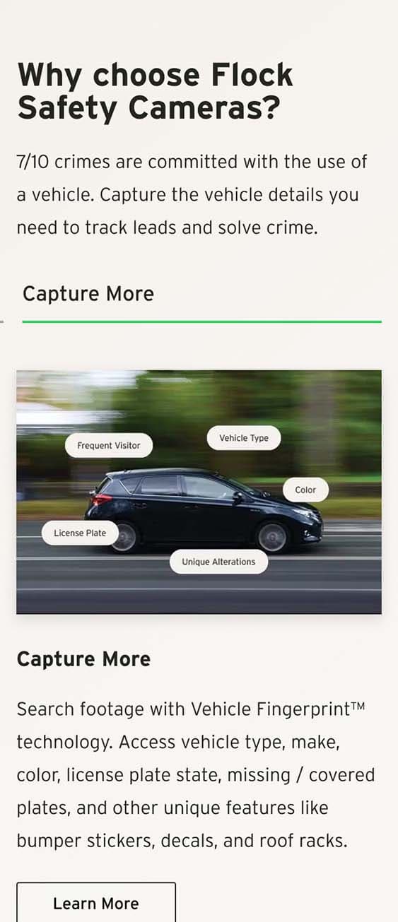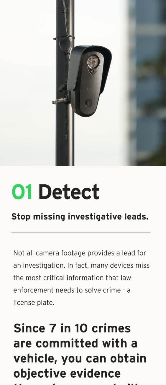 By working with the whole community - neighborhoods, businesses, law enforcement, and elected officials - their services help solve upwards of five percent of all reported crimes in America. Flock’s union of hardware and software helps communities stop crime, protect privacy, and mitigate bias.