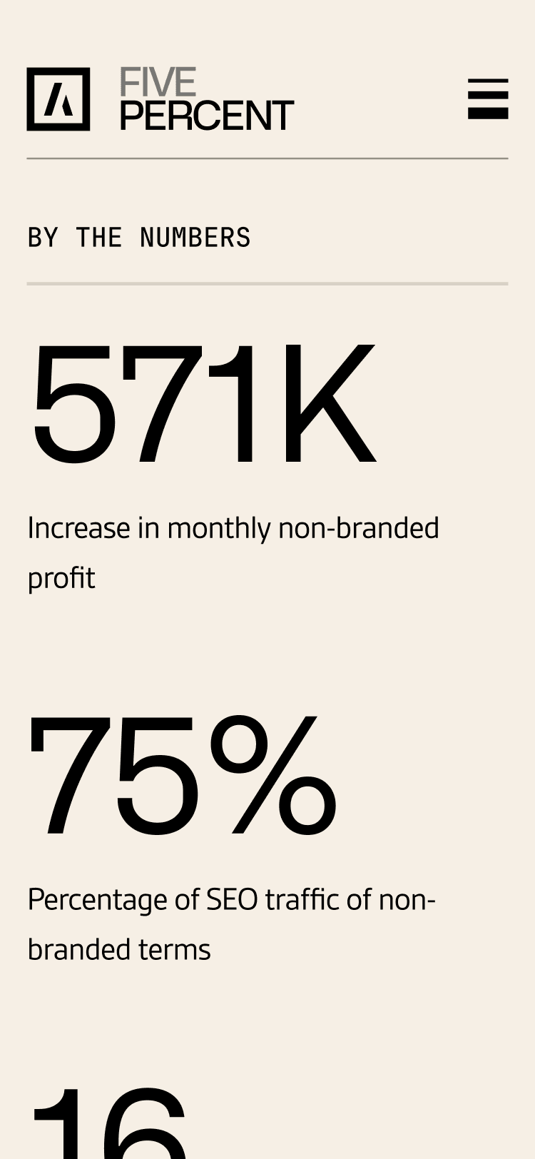 When Graphite, a growth agency specializing in SEO and content strategy, set out to create a hub for high-impact search strategies, they turned to ANML for design expertise. The result was The 5%, a content hub built to house Graphite’s most valuable insights. The name reflects a crucial SEO truth: while 95% of SEO work yields minimal impact, it’s the remaining 5% that drives real results. ANML crafted an engaging, intuitive platform that not only showcases Graphite’s thought leadership but also empowers readers to focus on the strategies that truly move the needle.